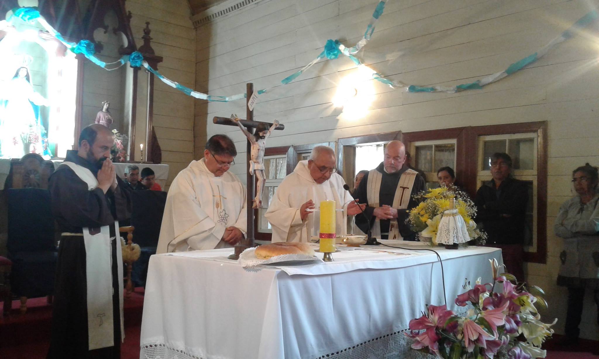 En esta oportunidad el obispo de Andud, Mons. Juan María Agurto y en compañía de los hermanos franciscanos de Castro y de los misioneros que se encuentran en las islas misionando durante este verano 2017, han celebrado la fiesta patronal de Llau-Llao y junto con ello, han dado gracias a Dios por el servicio sacerdotal del Hno. Leonardo Andrade que ha celebrado 60 años de ordenación sacerdotal.