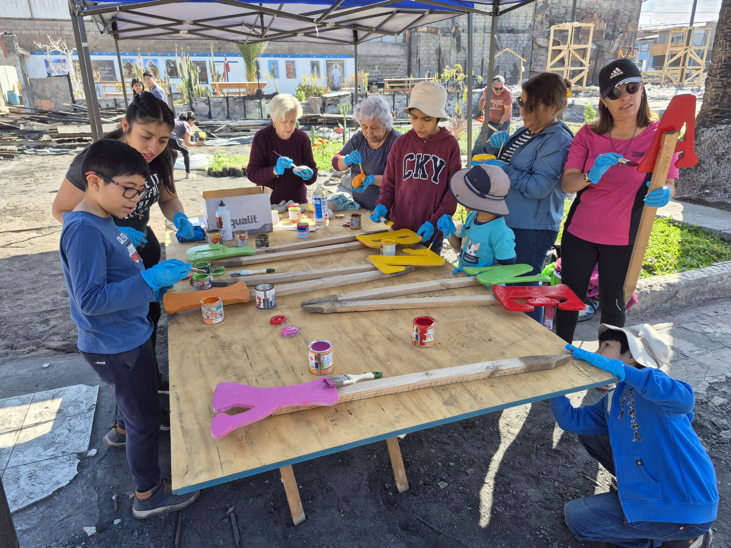 Posteriormente, se llevaron a cabo distintas acciones concretas que dieron nueva vida al espacio. Entre ellas, la plantación de 200 especies donadas por el Parque Santa Rosa de Alto Hospicio, gracias al apoyo del MINVU, además de trabajos de picado y retiro de veredas en mal estado. Niños y niñas franciscanos, junto a miembros de la Orden Franciscana Seglar, se sumaron pintando las letras “Paz y Bien” y decorando piedras ornamentales que embellecieron el entorno.